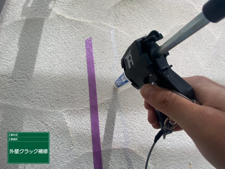 モルタルの外壁には付き物ですが、外壁のクラック(ひび割れ)は専用の補修材を使用してヒビの内部に充填しながら補修を行います。