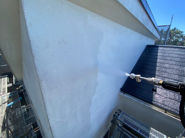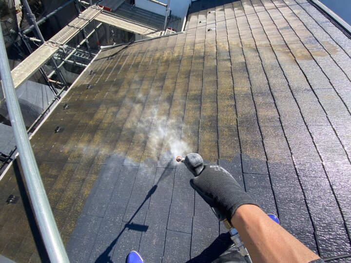 これによりコケやカビ、脆弱な塗膜や下地も同時に洗い流していきます。
