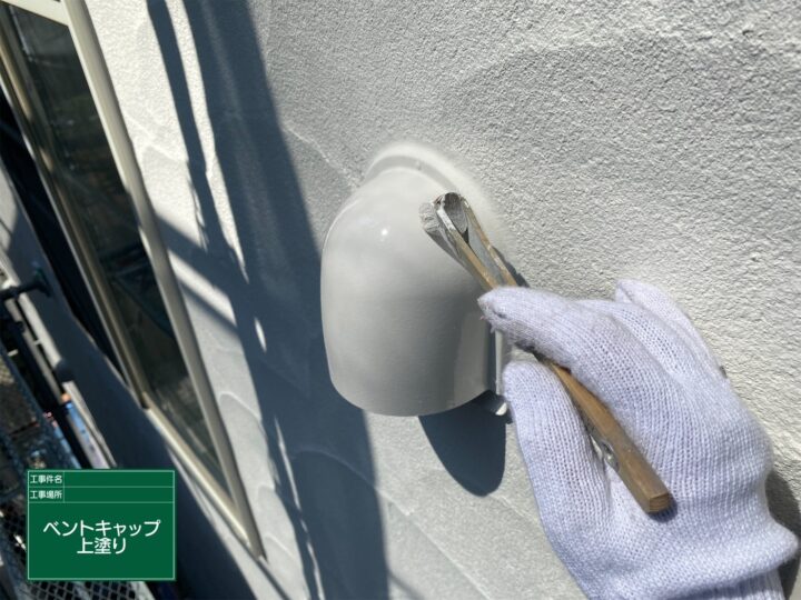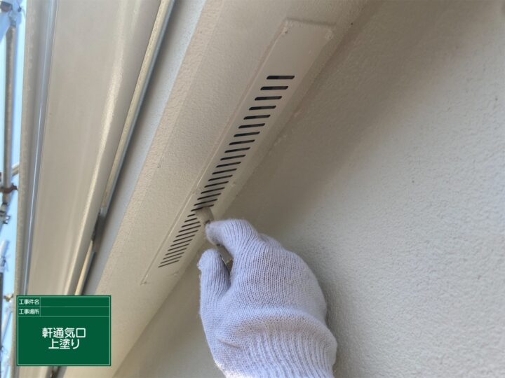 錆が出やすい軒天井の通気口も下地処理をし、中塗り、上塗りで仕上げます。