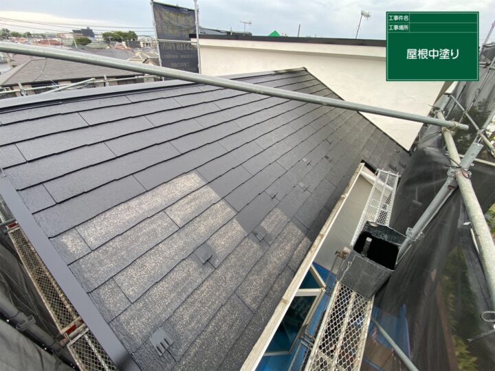 屋根の中塗り(上塗り)はスレートや板金部分共にローラーや刷毛を使用して丁寧に塗装いたします。