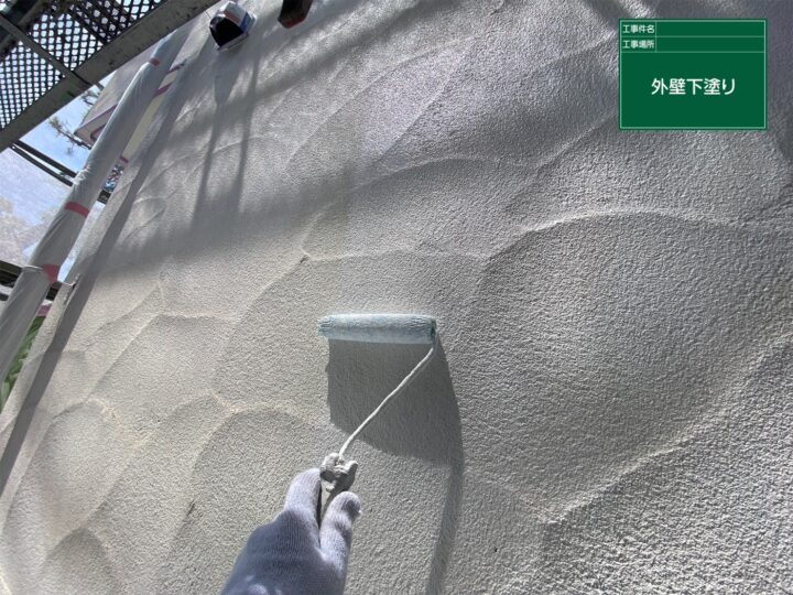 モルタル外壁ジョリパット仕上げの既存外壁には、シーラーという浸透性のプライマーを塗布し、下地にしっかりと浸透して上塗り塗料の密着性を高めます。